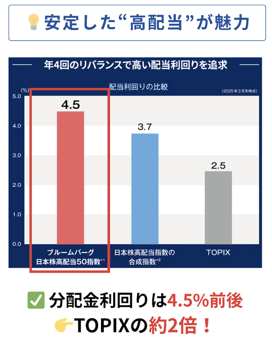 配当利回りが高い上位50銘柄を厳選し、さらに均等投資を行うというアプローチが本商品の魅力です。