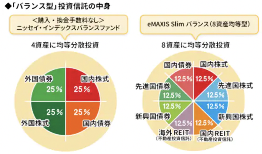 4資産に均等投資する「ニッセイ・インデックスバランスファンド」と8資産に均等投資する「eMAXIS Slimバランス(8資産均等型)」ですね。