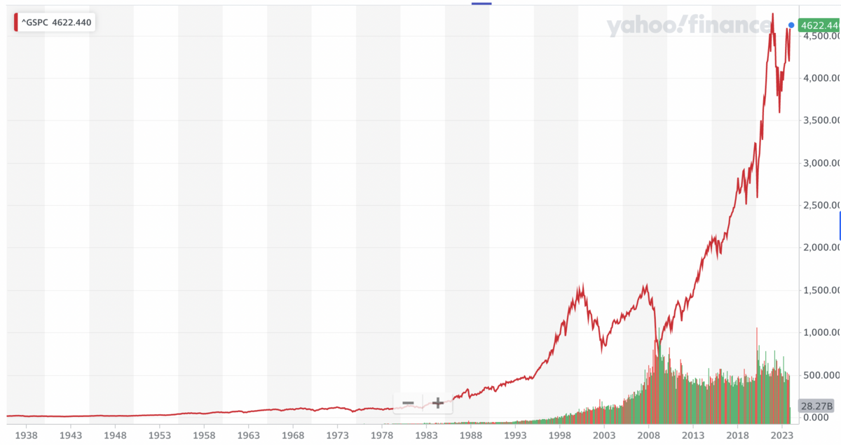 以下は米国を代表する株価指数であるS&P500の超長期チャートです。