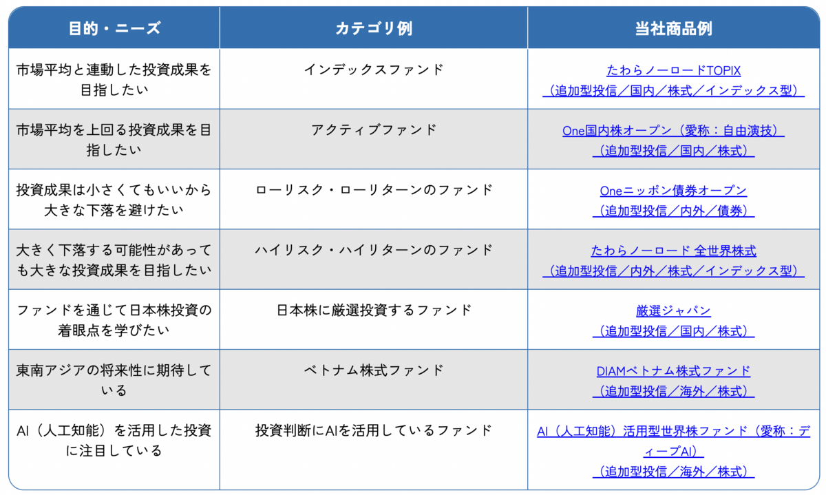 また、以下の表のとおり、一口に投資信託と言っても実は様々な商品があることが分かります。